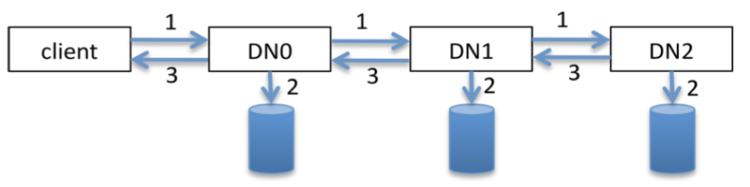 为了保证高可靠性,文件默认以三副本的形式保存在HDFS上,当client开始写入一个新文件的时候,首先会找出三个DataNode建立pipeline,随后数据以packet为最小单元,依次通过pipeline里的三个DN,完成三副本写入。